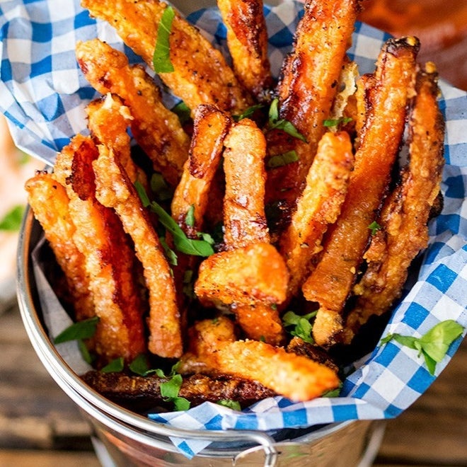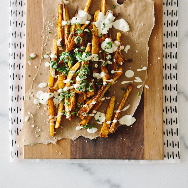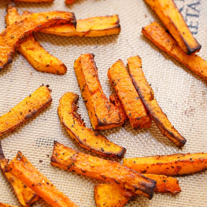 Cut veggies like winter squash, parsnips, turnips, and carrots into fries, then season and bake ‘em. It’s a great, healthier way to satisfy a carb craving.