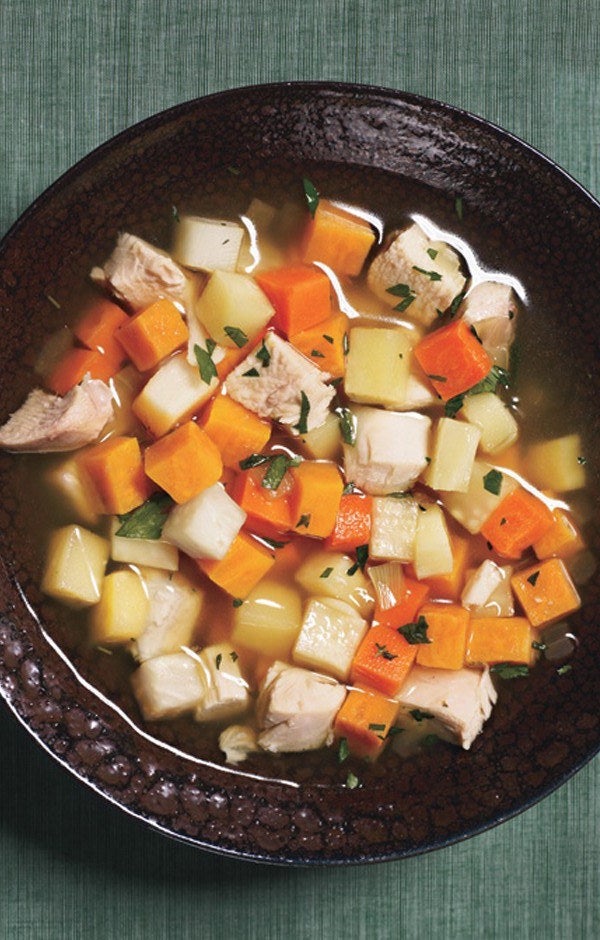 Recipes (clockwise, from left): Chicken Soup with Root Vegetables, Tuscan Bean Soup